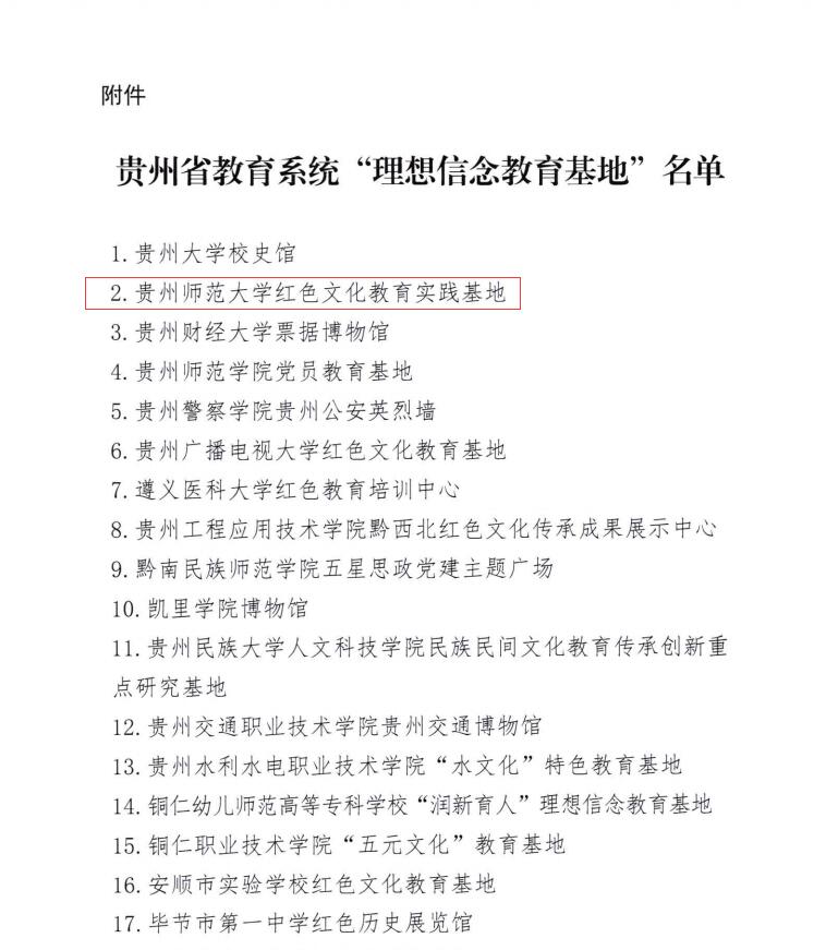 近日,省委教育工委、省教育厅公布了贵州省教育系统"理想信念教育基地"入选名单,我校红色文化教育实践基地入选。